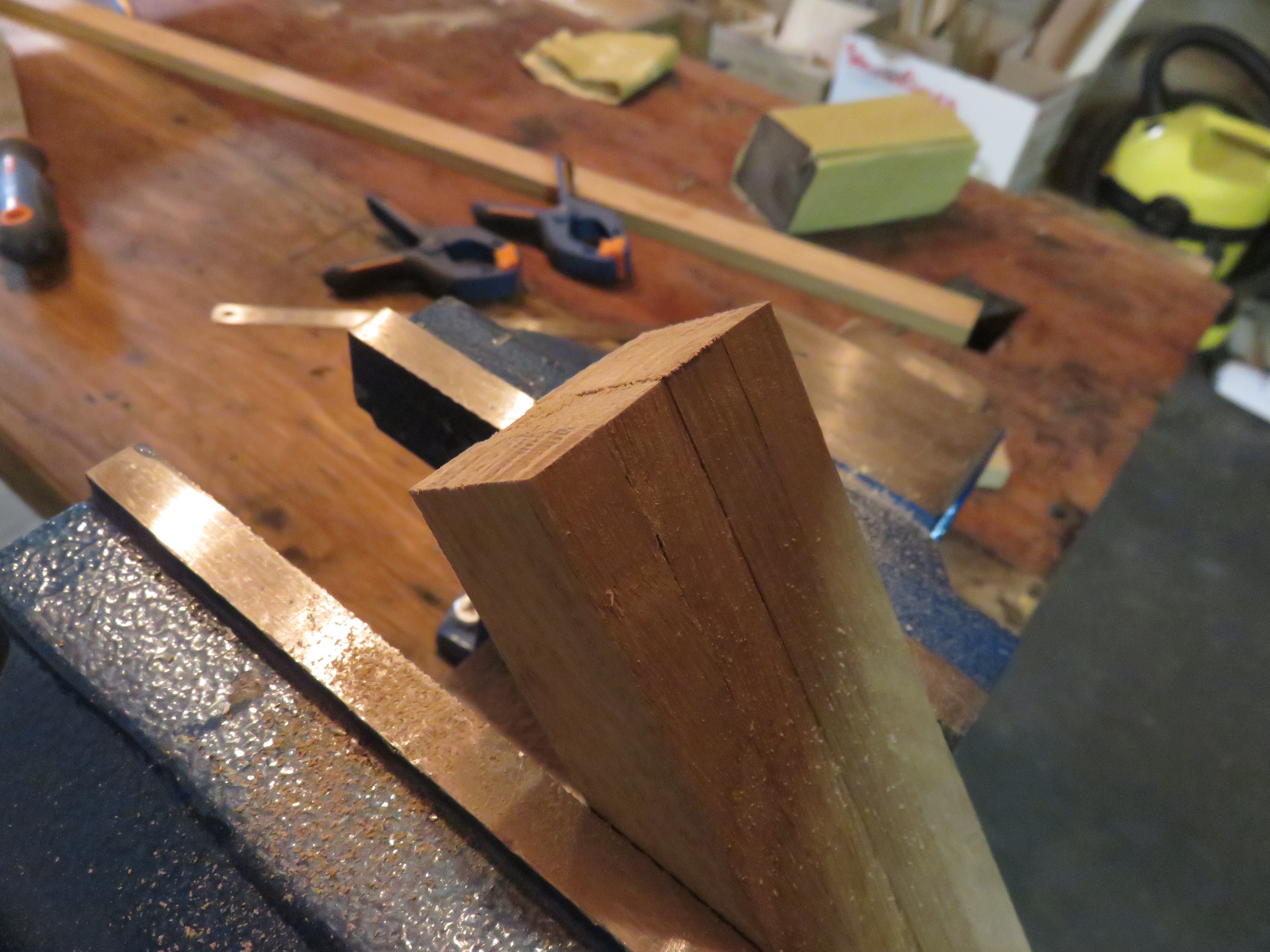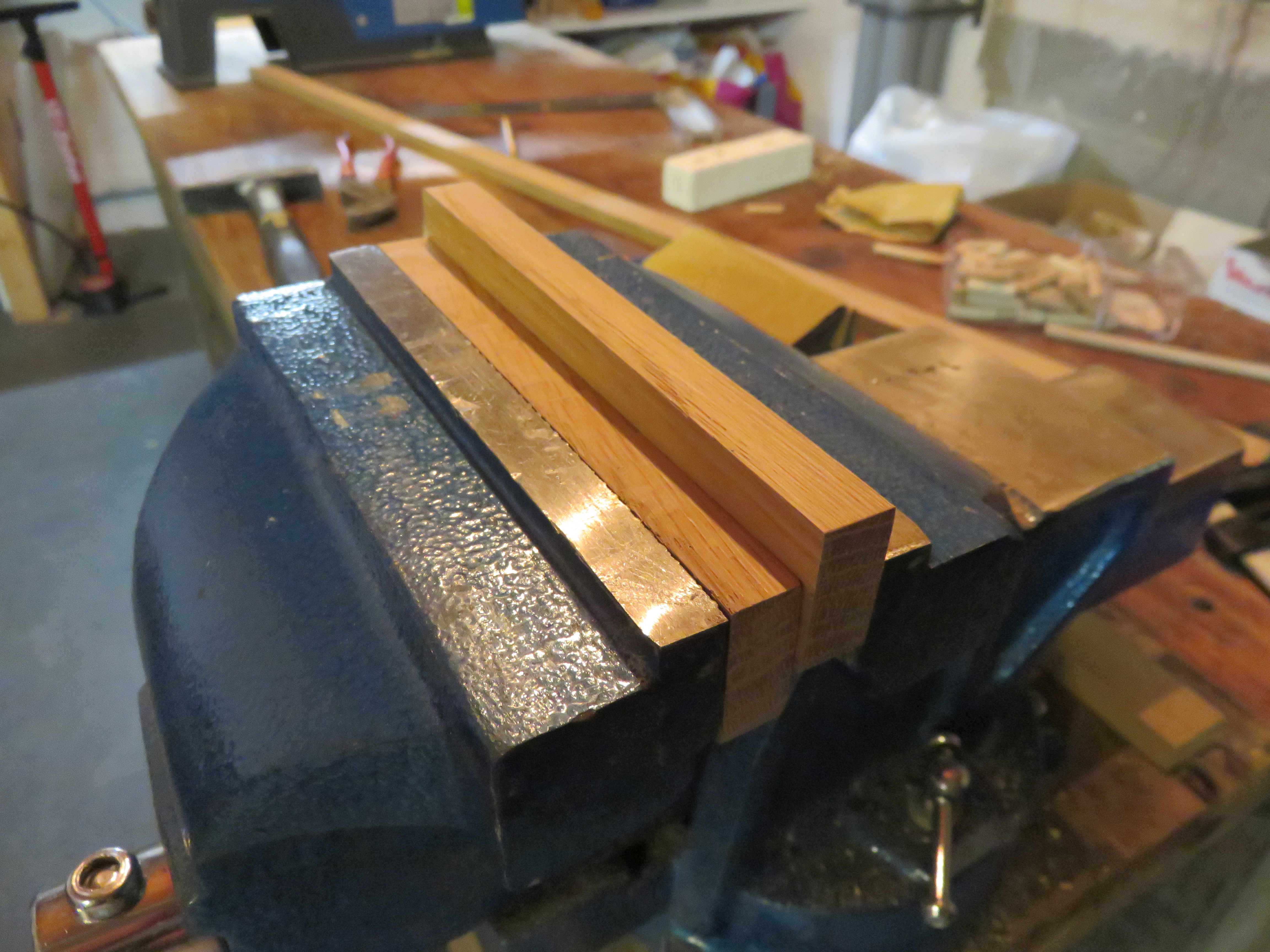 Je trouve une baguette de chêne dont je coupe quatre morceaux que je serre dans mon étau afin de les poncer et les rendre identiques.