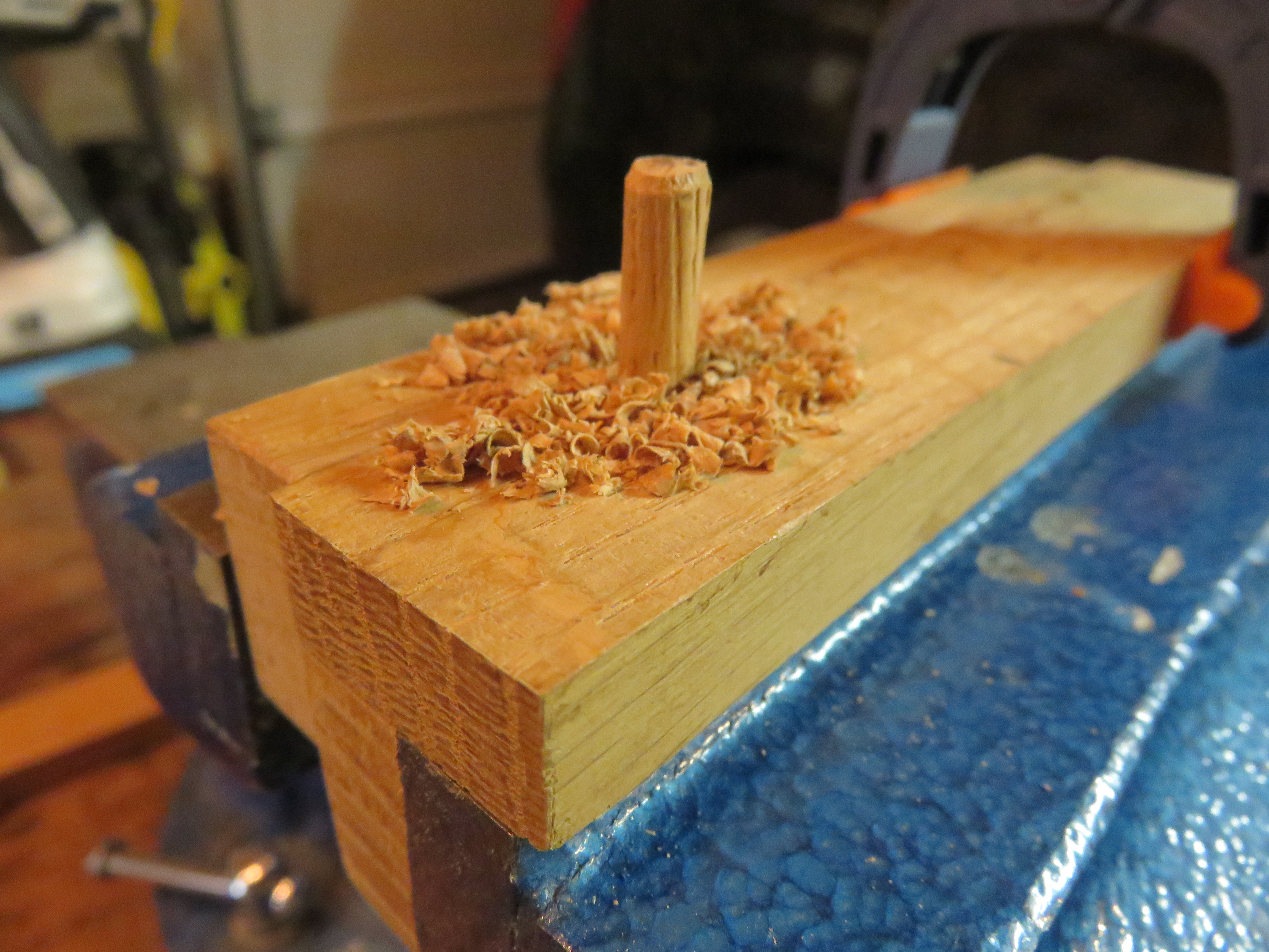 Je perce et je cheville les deux pièces de chêne pour former un L.