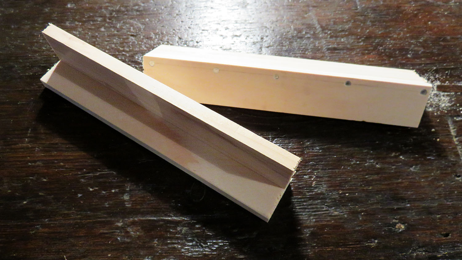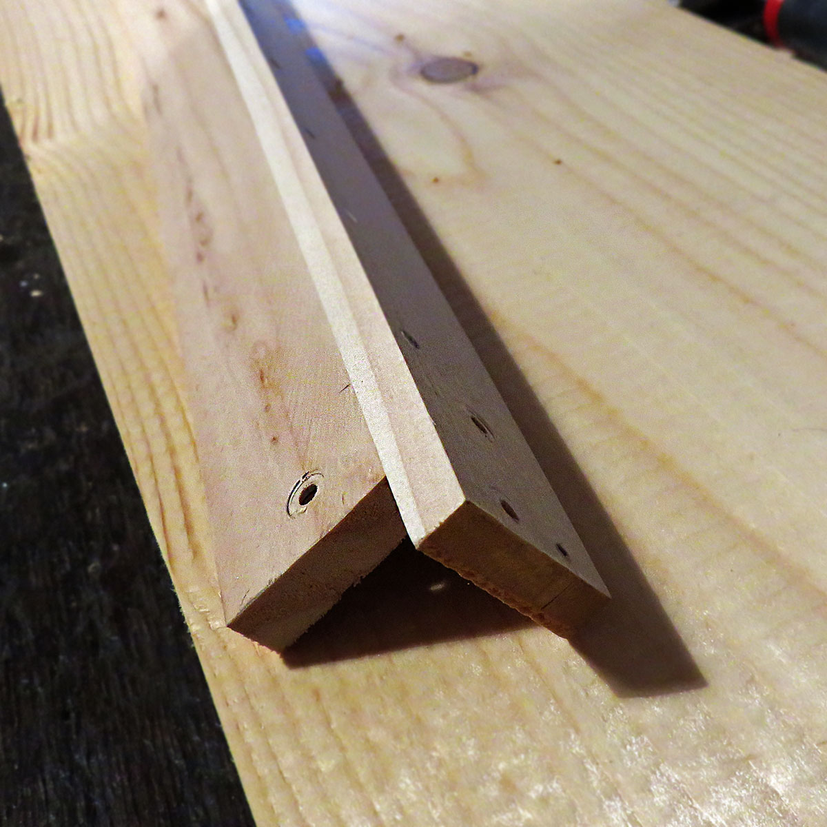 J’assemble deux planchettes de bois, très bien dégauchies, le long d’un plan de travail dont je suis sûr de l’angle droit. Je les visse chacune dans le plan de travail afin de pouvoir les clouer ensemble sans bouger.