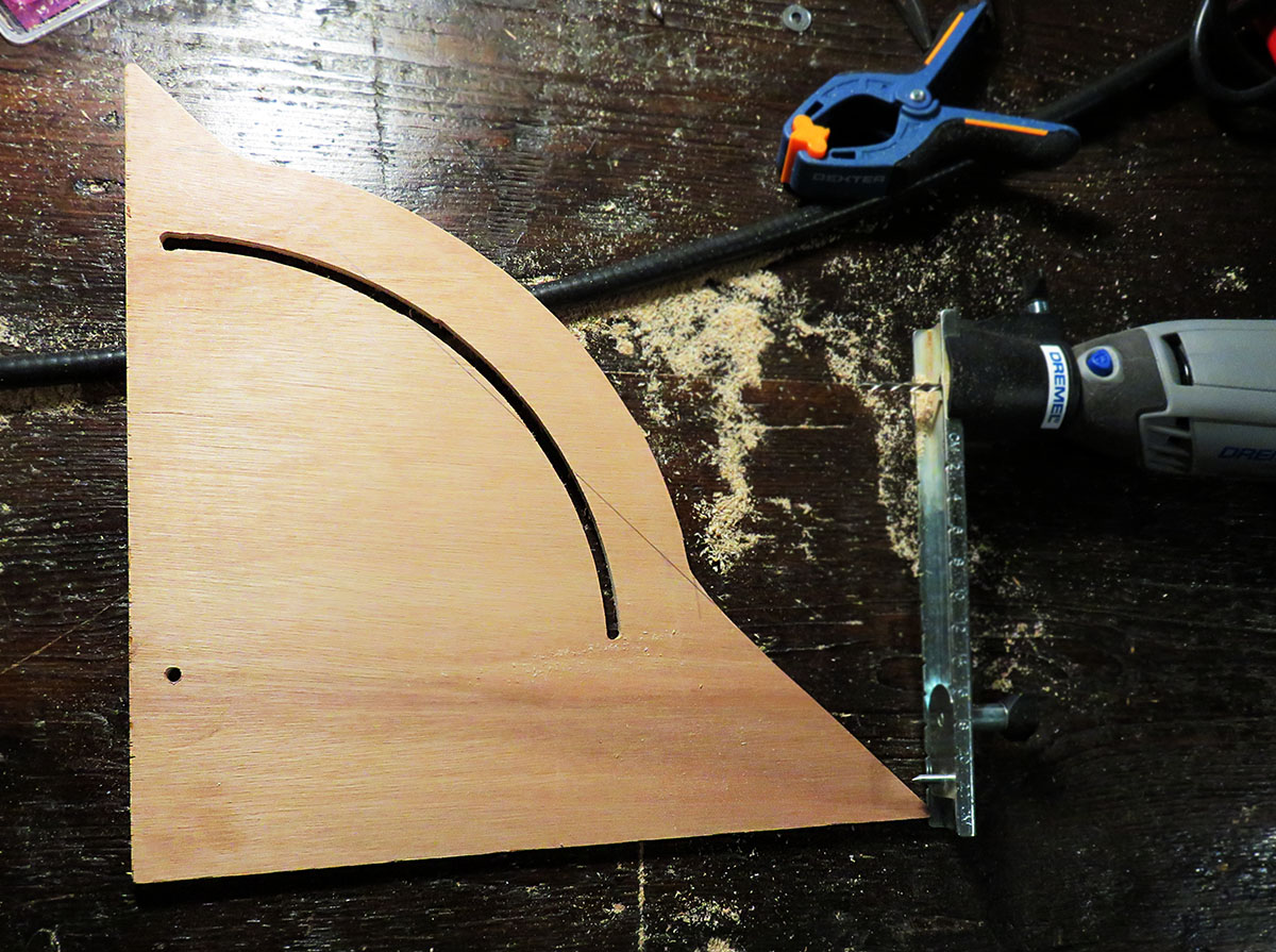 Je passe ensuite à la construction de la base. Je pars d’une planche de contreplaqué à laquelle je donne une forme entre l’équerre et le rapporteur. Dans le coin, je perce un trou et je grave une rainure en arc de cercle grâce à un outillage qui me permet de déplacer ma dremel à la manière d’un compas.