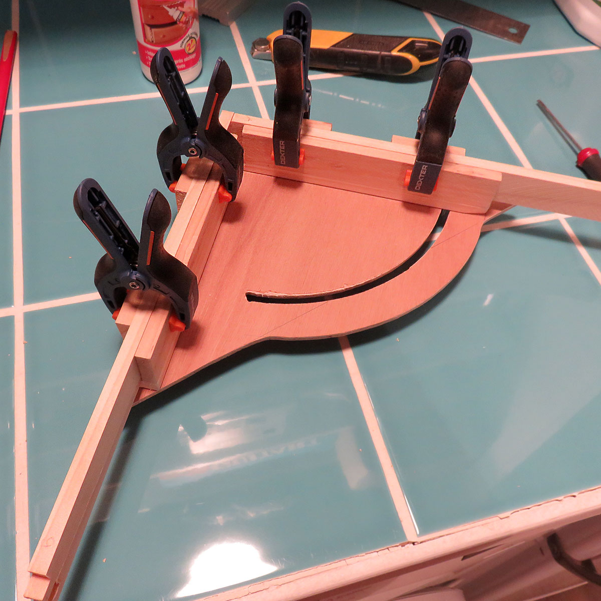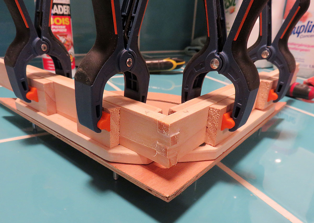 Le plus important est qu’une fois un angle réglé, l’ensemble soit le plus rigide possible et empêche tout déréglage. Voici mon nouvel outil à l’oeuvre pour assembler le cadre d’un jeu à venir …