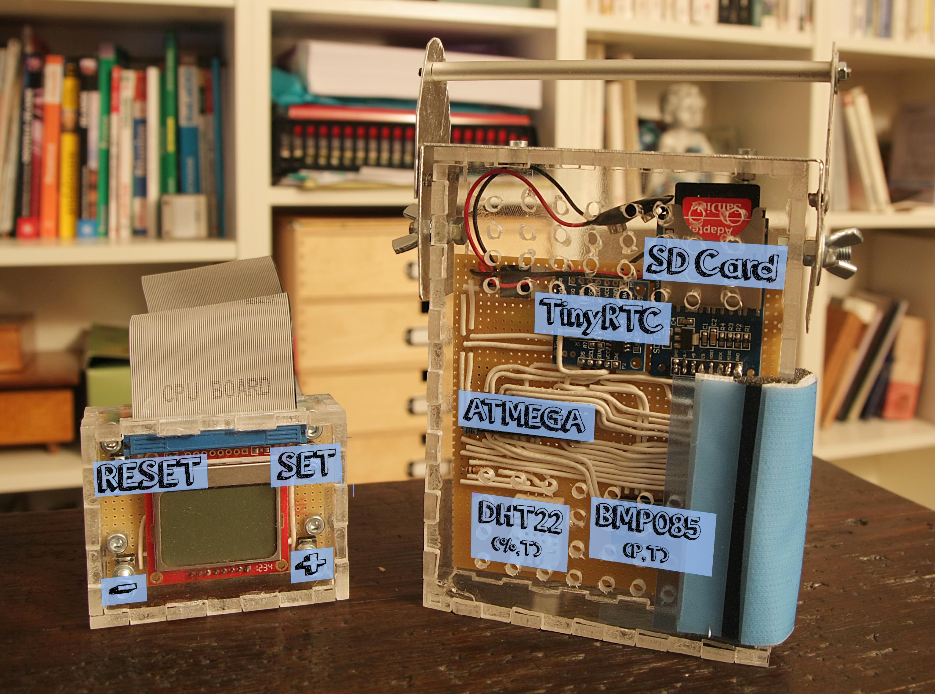 L’avantage de ces capteurs, c’est qu’ils possèdent un capteur de température intégré utilisé pour leur propre compensation. Celui du BMP085 est le plus précis, mais nous enregistrerons quand même les données du DHT22.